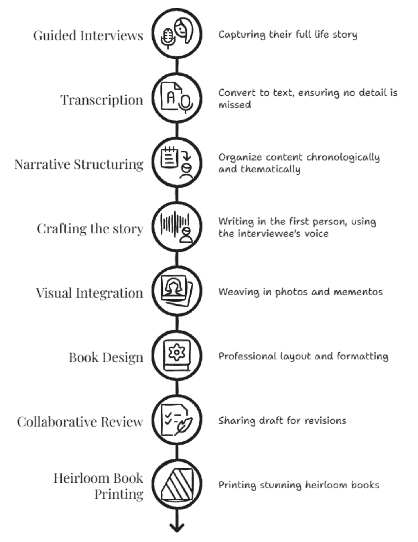 It all begins with a simple conversation. We sit down together for many hours, not just to hear your story, but to truly listen. Our only goal is to understand what is in your heart and mind, so we can find the beautiful and important truths in the memories you share.Next, we carefully craft your words into a powerful story that sounds and feels just like you. We then weave in your most treasured photos, bringing your memories to life right on the page. This is where your experiences are gently guided into a timeless story.Finally, we work together with you to make sure every detail is perfect. Your story is then placed into a beautifully designed, custom printed book, creating a treasure that is made to be held, shared, and passed down for years and years to come.